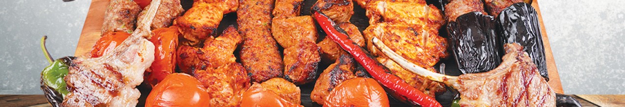 1/2 Adana kebap, 1/2 tavuk şiş, 1/2 fırın kebap, 1/2 kuzu şiş, 1/2 patlıcan kebap, 1/2 tavuk kanat, 1/2 kuzu pirzola, 1/2 domatesli kebap. Közlenmiş domates, biber, soğan, bulgur pilavı ile..